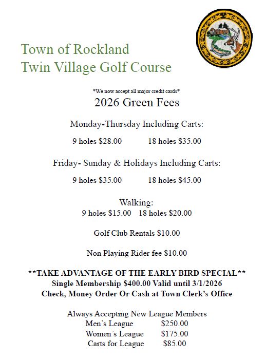 If you have any questions, feel free to contact Townclerk@townofrocklandny.gov or Twinvillagegolf@townofrocklandny.gov
